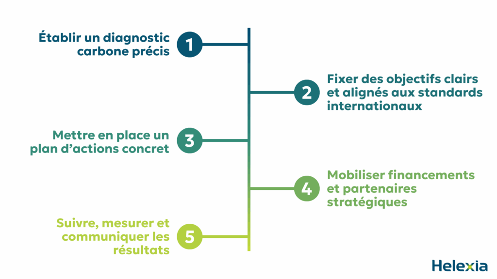 En suivant ces 5 étapes – diagnostic, objectifs, plan d’actions, financement, suivi – les entreprises s’assurent de mettre en place une démarche bas carbone crédible, durable et créatrice de valeur.