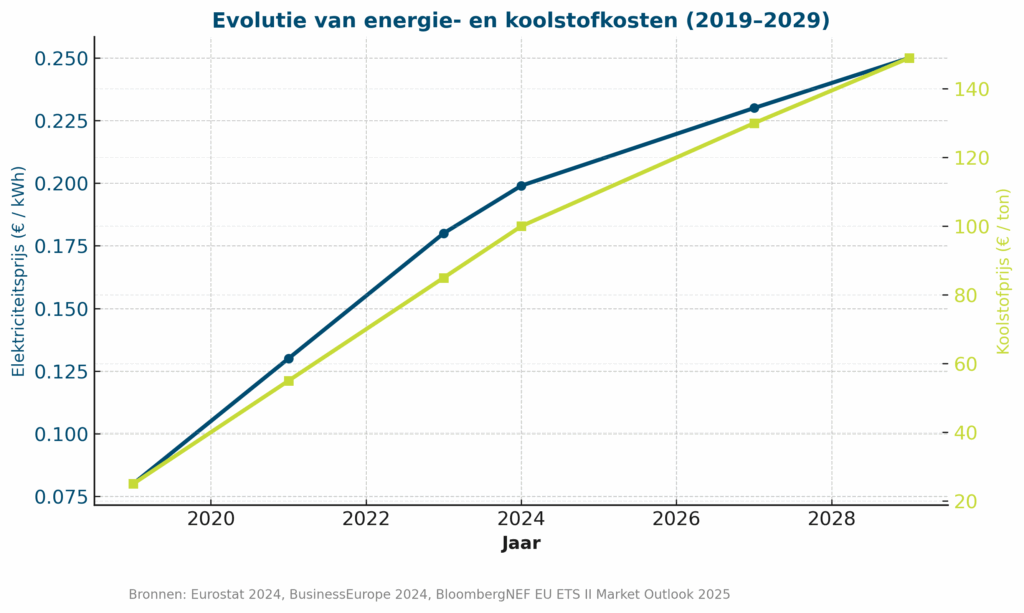 In 2027 treedt het ETS2-systeem in werking. Volgens BloombergNEF kan de CO₂-prijs oplopen tot 149 €/ton tegen 2029.